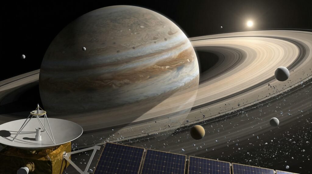 - Cassini-Huygens (2004-2017): This ambitious joint NASA/ESA/ASI mission revolutionized our knowledge of Saturn and its system. Cassini orbited Saturn for 13 years, sending back breathtaking images and invaluable data. It deployed the Huygens probe onto Titan’s surface, providing humanity’s first direct look at an alien moon’s surface. Cassini’s “Grand Finale” involved a series of dives into Saturn’s atmosphere, gathering unprecedented data before its planned destruction.