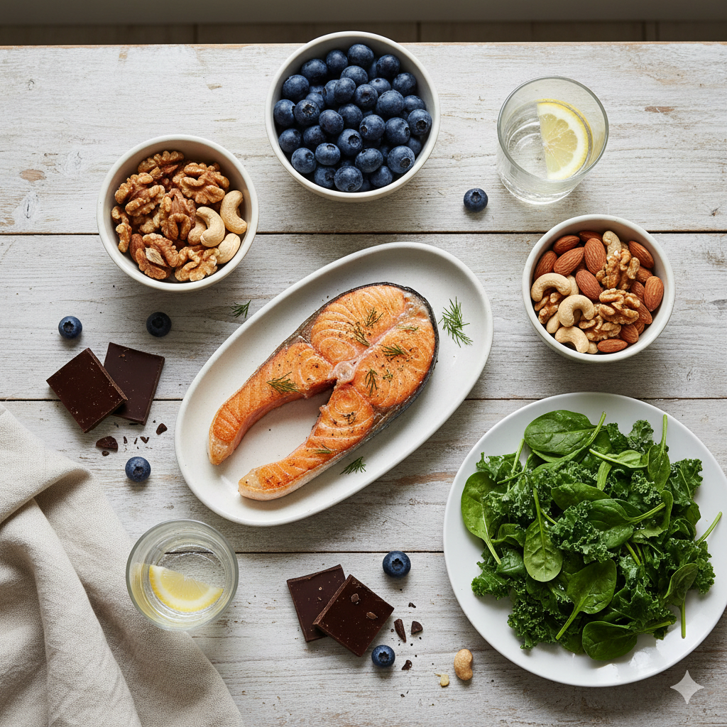 • Plan for adherence: Keep frozen blueberries, canned sardines, bagged greens, and a quality dark chocolate on hand to make brain-healthy choices automatic.