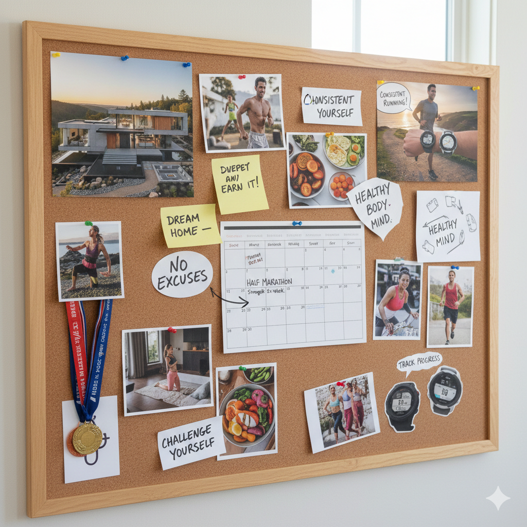 - Outcome imagery: Photos that represent your goal state—finishing a race, lifting confidently, moving with agility, feeling energized.