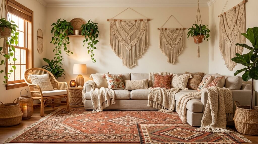 - Layered textiles such as kilim rugs, embroidered cushions, macramé, and throws