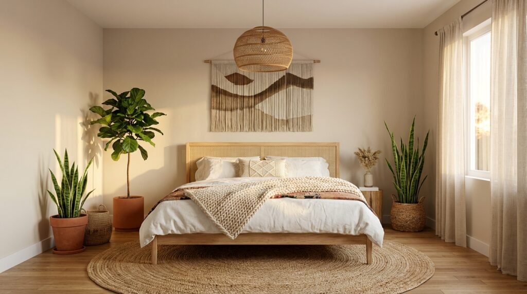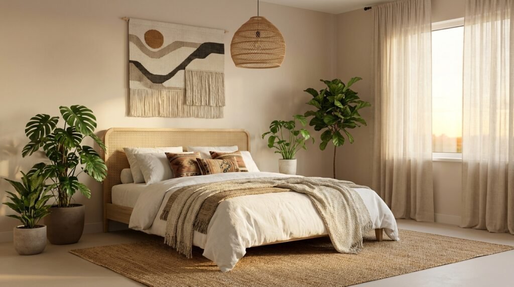 - Natural materials: rattan chairs, wooden stools, jute poufs, cane headboards, linen curtains