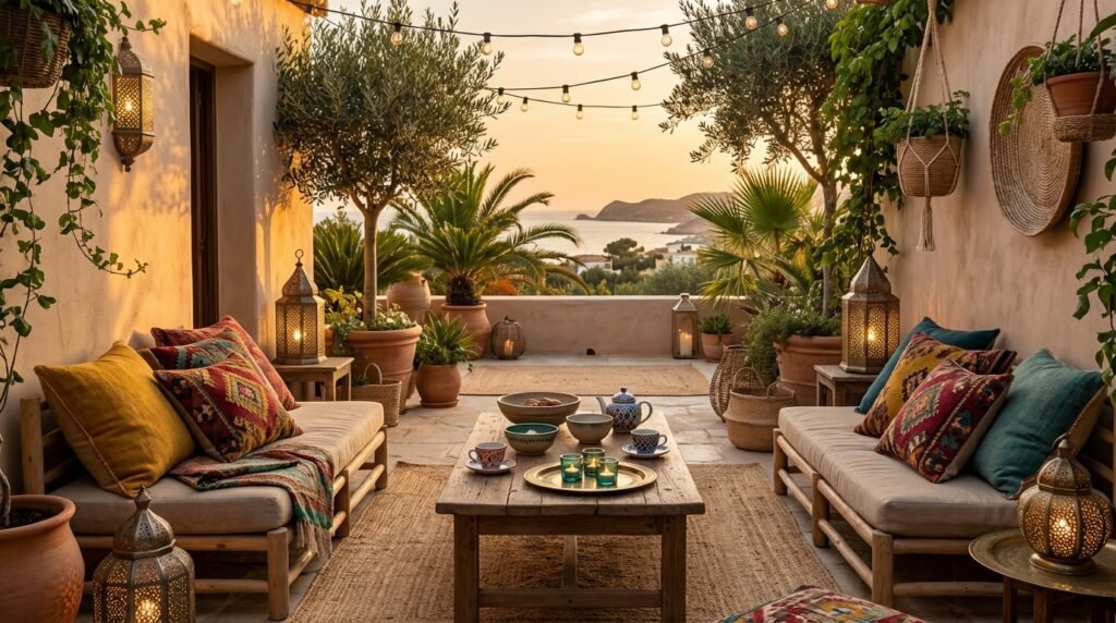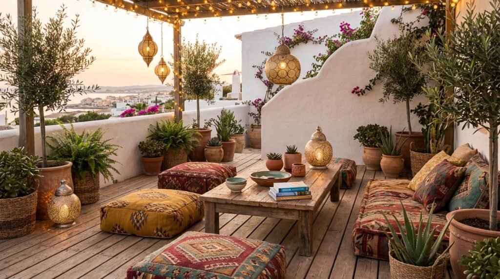 - Decorative lighting: string lights, lanterns, woven pendants, warm-toned lamps
