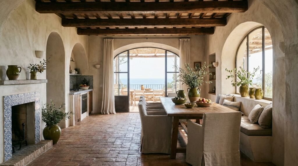 Natural materials interior design is central to Mediterranean spaces because it creates visual depth without relying on excessive decoration. Stone introduces permanence and coolness, especially in floors, hearths, and accent walls. Wood brings warmth and familiarity, whether through exposed beams, rustic cabinetry, or a generously scaled dining table.