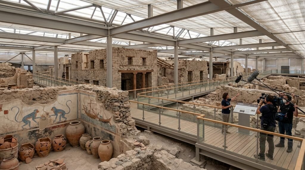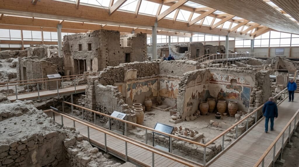 The site, now covered by a protective bioclimatic roof, allows visitors to walk along raised walkways through the remains of multi-story houses, storerooms, and public spaces. Archaeologists have uncovered sophisticated drainage systems, advanced urban planning, and finely crafted pottery, highlighting the settlement’s wealth and technological progress. Vibrant frescoes—depicting maritime scenes, flora, and daily life—reveal a refined aesthetic sensibility and close connection to the sea.