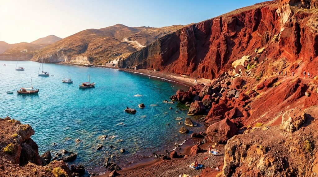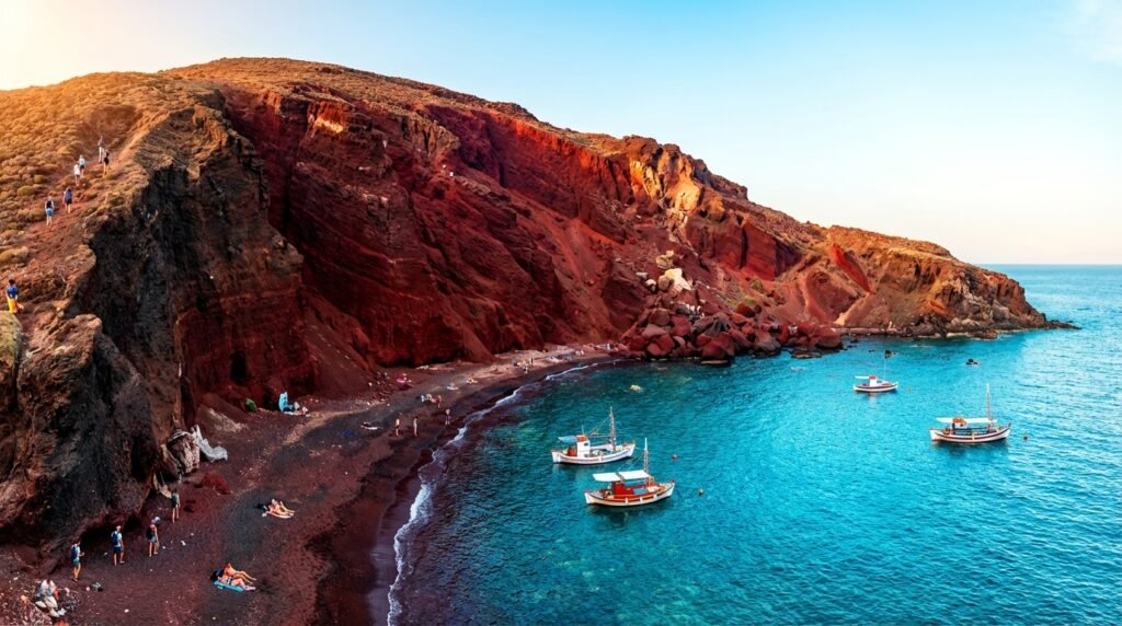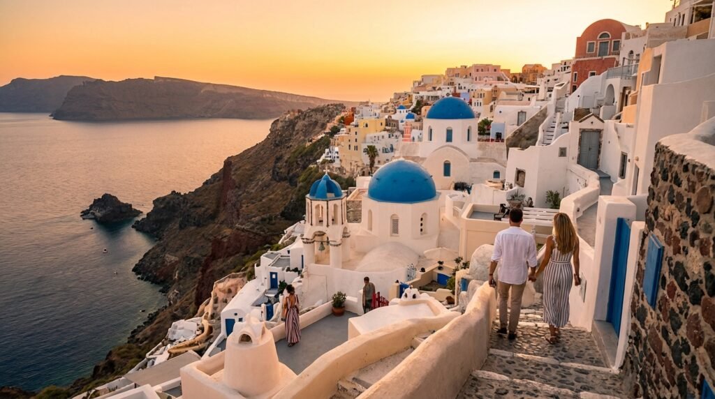 Santorini, part of the Cyclades island group in Greece, is renowned as one of the world’s most visually striking islands. Its distinctive crescent shape encircles a submerged volcanic caldera, creating vertical cliffs that plunge into deep blue waters. White cubic houses, blue-domed churches, and labyrinthine lanes cling to these cliffs, forming the emblematic landscape that has made Santorini a global icon.