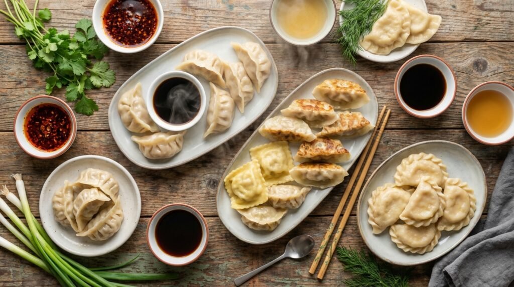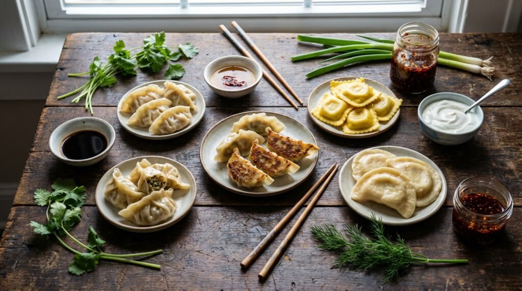 Assorted dumplings from around the world including jiaozi, gyoza, ravioli, and pierogi served with dipping sauces and fresh herbs.